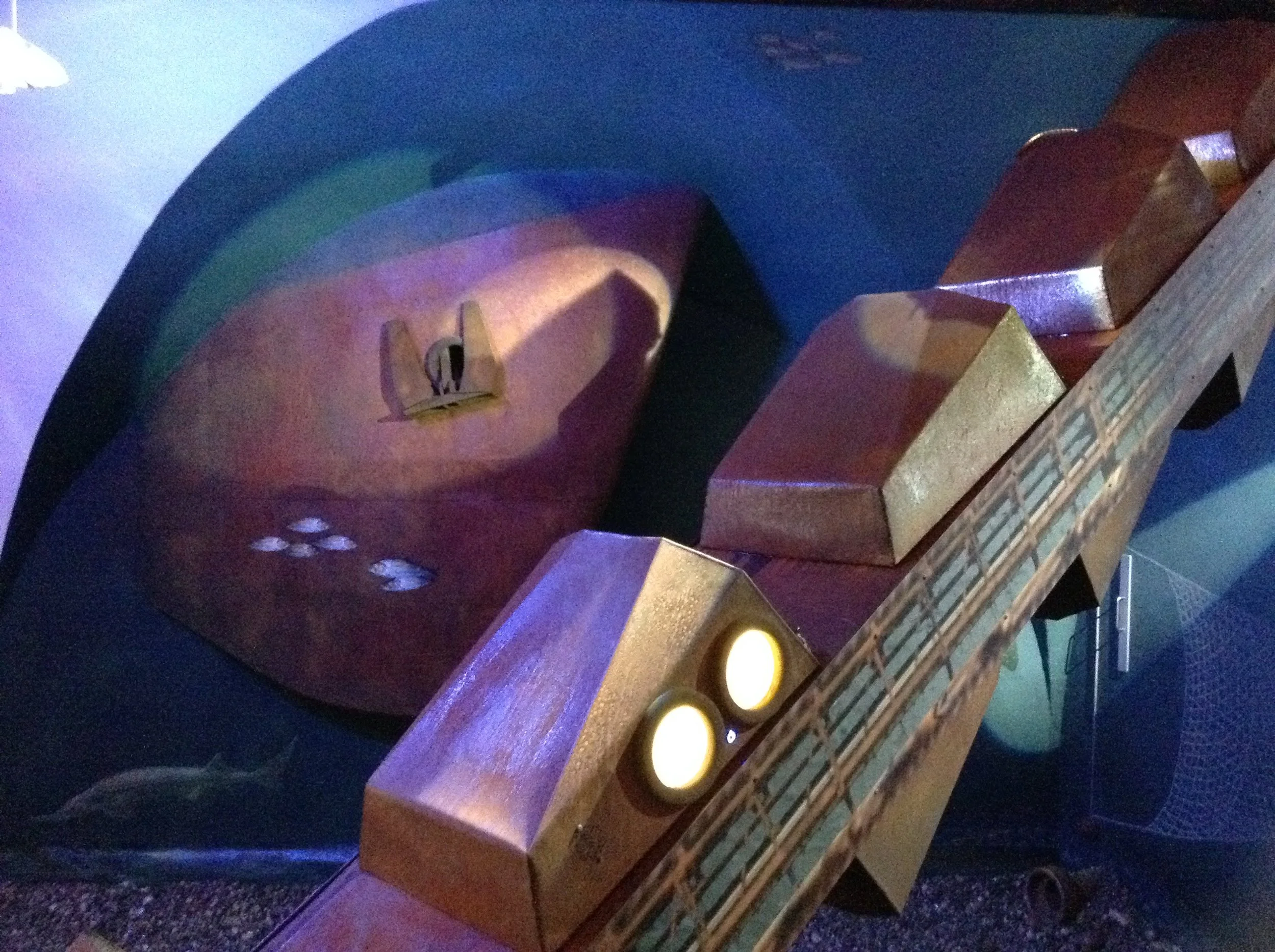 Videos von 10 Zeitepochen werden hinter der Skulptur projiziert. Man kann eine Epoche auf einer Zeitskala auswählen, indem man eine Kugel nach unten schiebt. Danach fährt die Kugel automatisch wieder in die Ausgangsposition zurück.